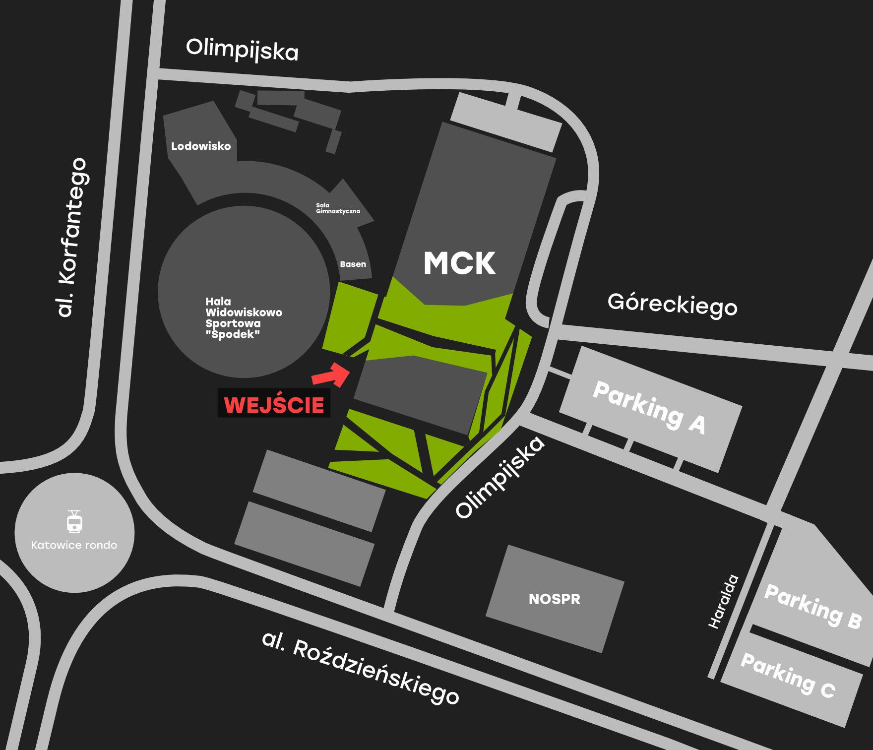 Wejście na konferencje znajduje się od strony placu Sławika i Antalla przy Spodku.